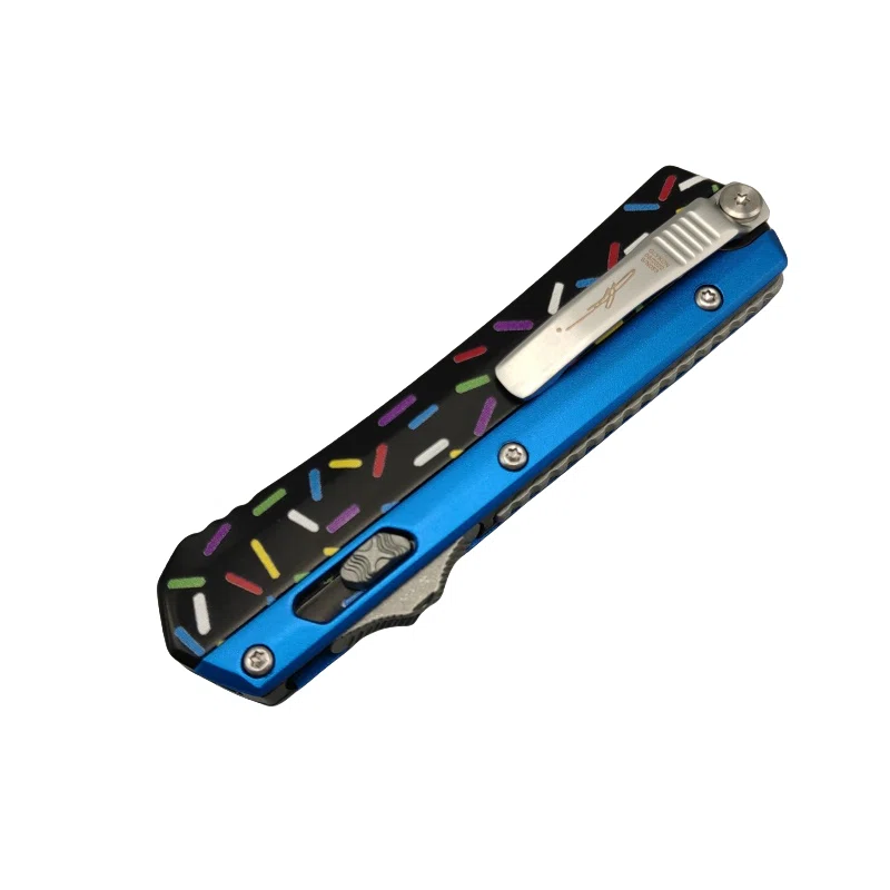 A colourful and compact OTF knife with a fun sprinkle-pattern grip and a bold blue frame—where style meets precision.