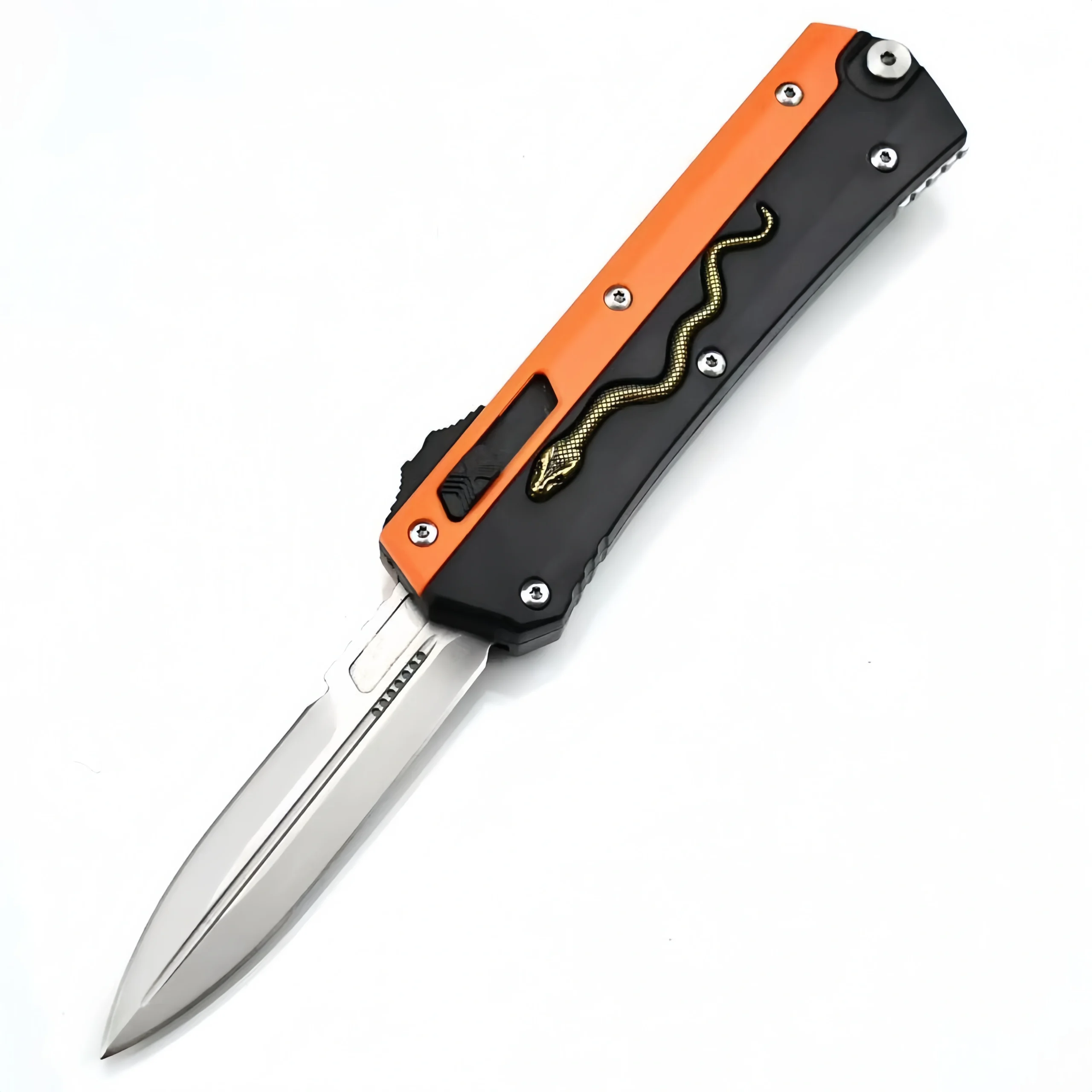 Overall Length: 9.00“ Blade Length: 3.50″ Blade Thickness: 0.12″ Blade Steel: D2 Blade Style: Drop Point Blade Finish: Satin Edge Type: Plain Handle Length: 5.50″ Handle Thickness: 0.50″ Handle Material: Aluminum Handle Color: Black Weight: 4.90 oz. User: Right Hand, Left Hand Pocket Clip: Tip-Down Knife Type: OTF Automatic Opener: Thumb SlideSwitchblade Flick Knife OTF Messer